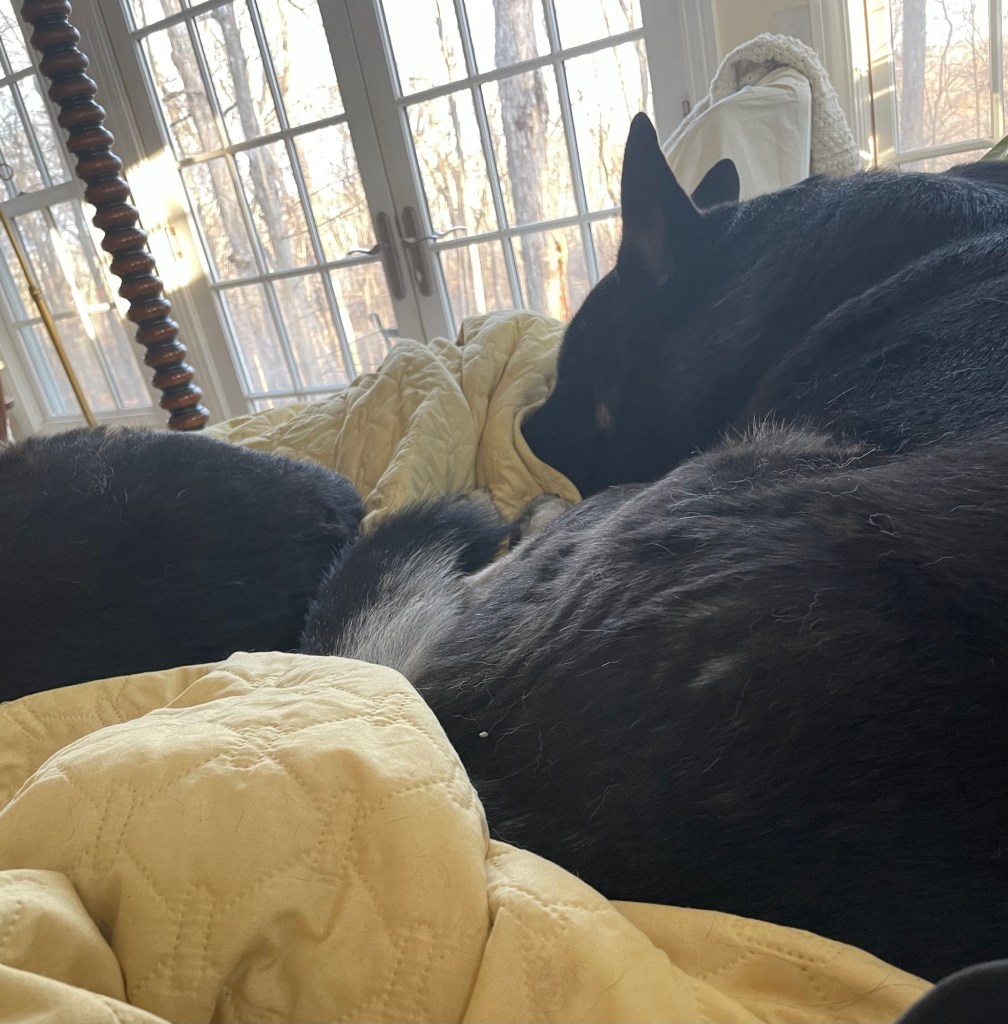 1. They look so comfortable and relaxed. I can’t even imagine sleeping with 2 shepherds. We finally had to get a queen sized bed for us and 3 dachshunds. Now that we are down to 2, the extra space is plentiful. 🤣🤣🤪