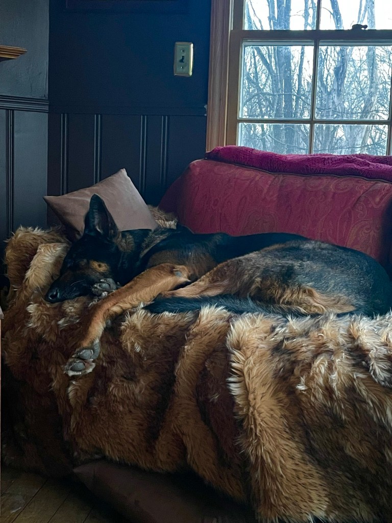 Are you tired of dogs on the couch photos? This is what I see most of the day while I’m working, and I keep forgetting to take photos when we’re walking.