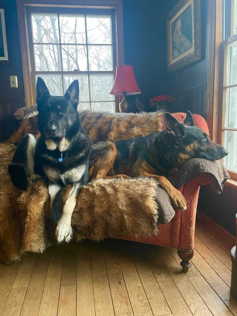 Eli is the cuddliest, mildest-tempered, neediest dog I have ever known. I have no doubt this is due to his having been brought home days before the COVID lockdown. We were not able to socialize him properly, and he depended entirely upon our small household for everything. Most of the time he is submissive to Auggie’s leadership, but lately, as Auggie approaches his seventh birthday and begins to slow down a bit, Eli has started asserting himself.