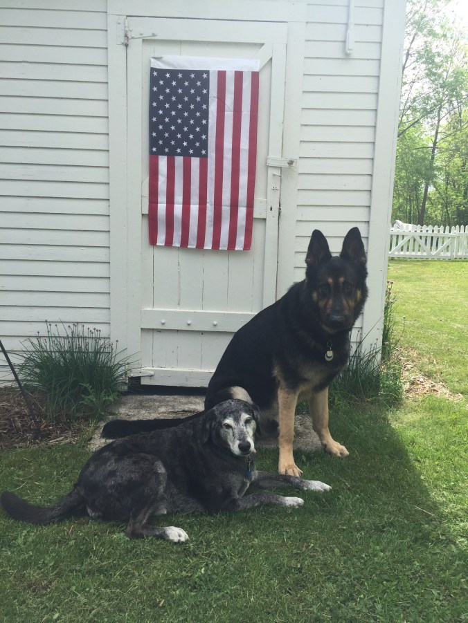 This left Moses, our 125 pound German Shepherd, who has been known to jump horse hurdles in agility classes, and has an intellectual capacity superior to that of a small child. He held my gaze and thumped his tale affectionately. He is a well-trained–and, like both my dogs–a very well-loved animal. He knows the rules. He lies peacefully nearby while we eat. He takes treats gently from fingers. He asks to go out. He comes when he’s called, crashing thunderously through the underbrush when drawn away from chasing a deer, to sit, panting, at my feet. He stays where he’s been told for long periods of time in unfamiliar environments. He is certified to go to schools and hospitals, and it is only my own schedule that keeps him from being certified as a therapy dog. He is my heart and soul.