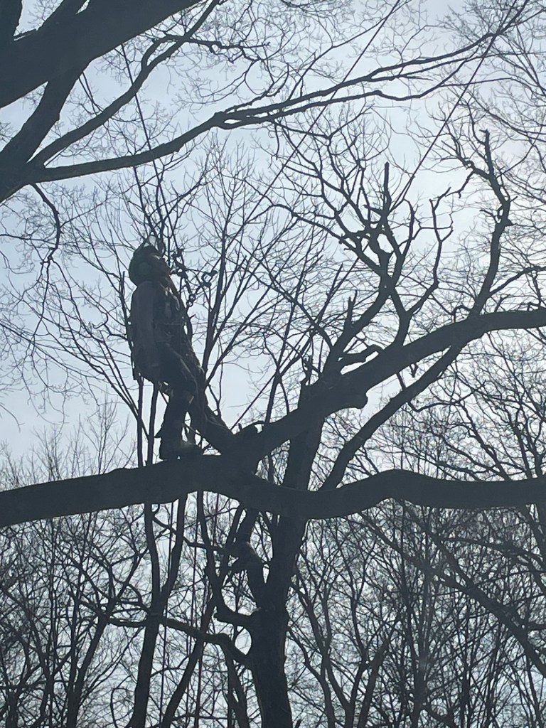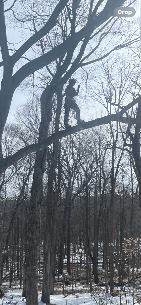 Getting ready to trim back a massive beech limb that’s lying on the roof.Johanna contemplates her plan. You can see all the cables she uses for safety here.