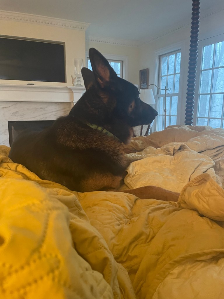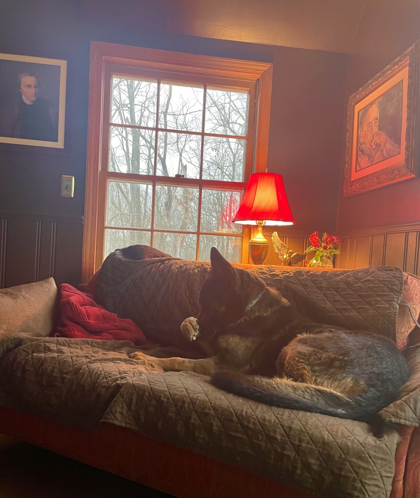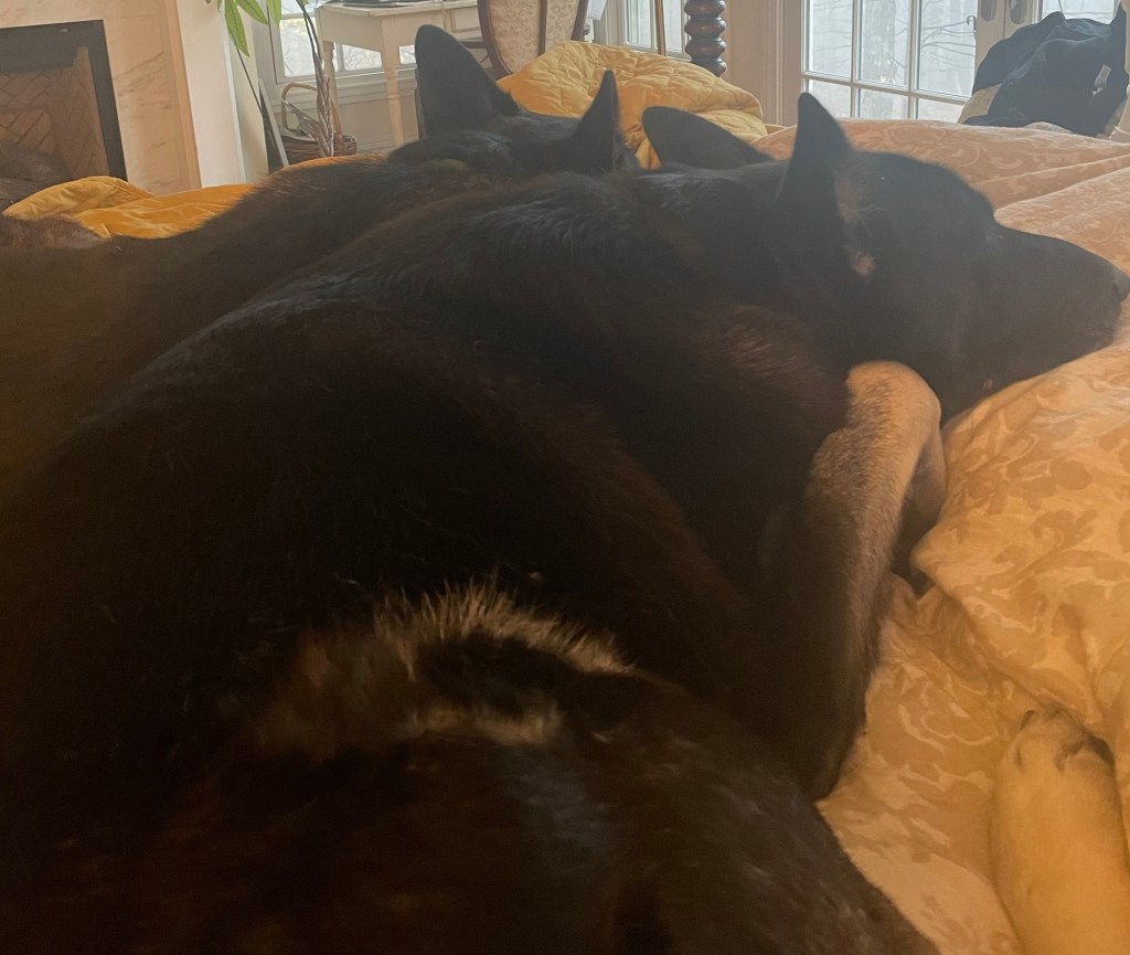 Dad’s upstairs reading for an important interview while I read a novel and snuggle with dogs. By midnight Auggie will be squashed up against me as close as he can be. This is new. He was traumatized by the hospital kennels. Nothing in his life before prepared him for being separated from us.