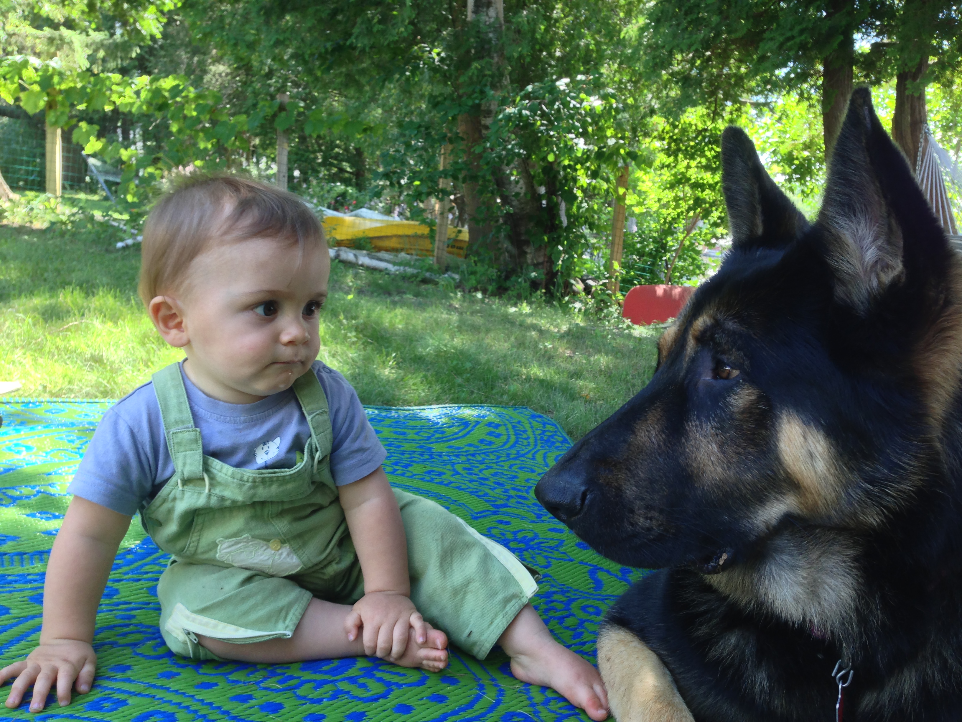 We got up at 5 that Saturday morning and drove the twelve hour round trip to an Iowa farm on a dirt road in the middle of nowhere, leaving Pete at home with a friend. It was so remote the GPS didn’t recognize the place. We arrived around noon. Even knowing what I knew about the disposition of these dogs I was a little nervous about getting out of the car while an extremely large German Shepherd with an enormous head barked at us. But when we met, he gently nudged my hand and then leaned against each of us separately like a big cat. We knew who he was. We had seen his picture on the breeder’s website standing shoulder to shoulder with a pony. This was our puppy’s uncle. We met the family: Dad, Mom, Grandma, another uncle, a full brother from another litter, and, of course, the puppies.