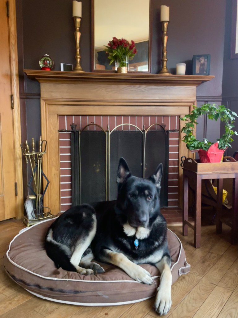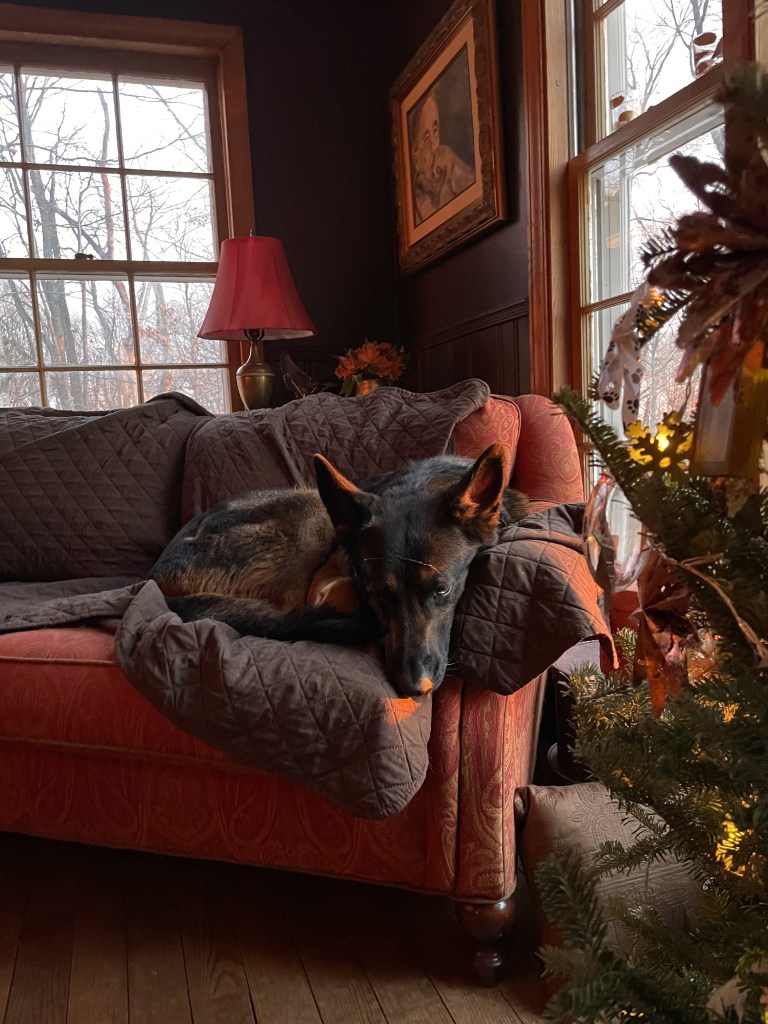 Nevertheless, on the way home, parked alongside the road to our house was an armada of utility trucks, and the big tree that had been leaning perilously on the main lines was gone. The dogs greeted us as if we’d been gone a month, even though it had been little more than an hour. The house was ridiculously dark and growing cold, so we settled into a very early bed, with dogs and the gas fireplace to keep us warm, buckets of snow on the hearth, downloaded movies, and a decanter of Irish whisky.