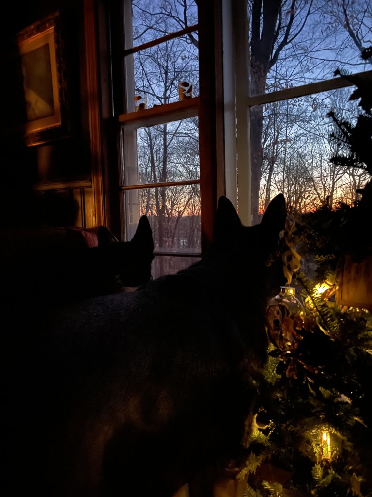 There was a spectacular sky this morning. A front coming through created a sharp diagonal line of clouds moving against the hot pink and orange of sunrise. Two great horned owls conversed at some length. I bestirred myself from my writing and stepped out onto the back stairs to look out over the woods, listen, and breathe. It’s cool this morning, cool enough for snow. But there’s only rain in the forecast.